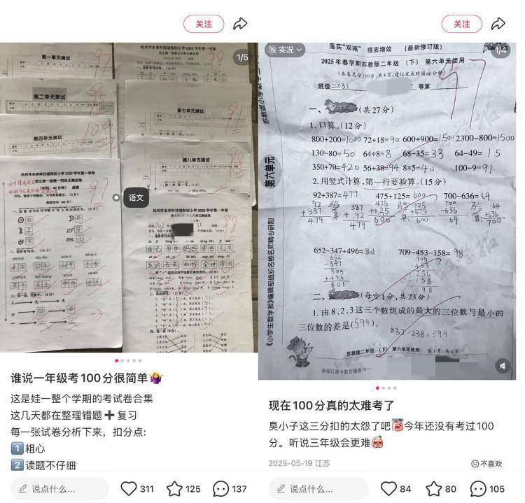 俞女士家的两个儿子分别就读于小学一年级和三年级,一年级的孩子还有考满分的情况,三年级的娃就难多了,“除非像去年英语期末过关那种选择题、填空题占比多的,相对简单,班上满分的孩子会多一点。”